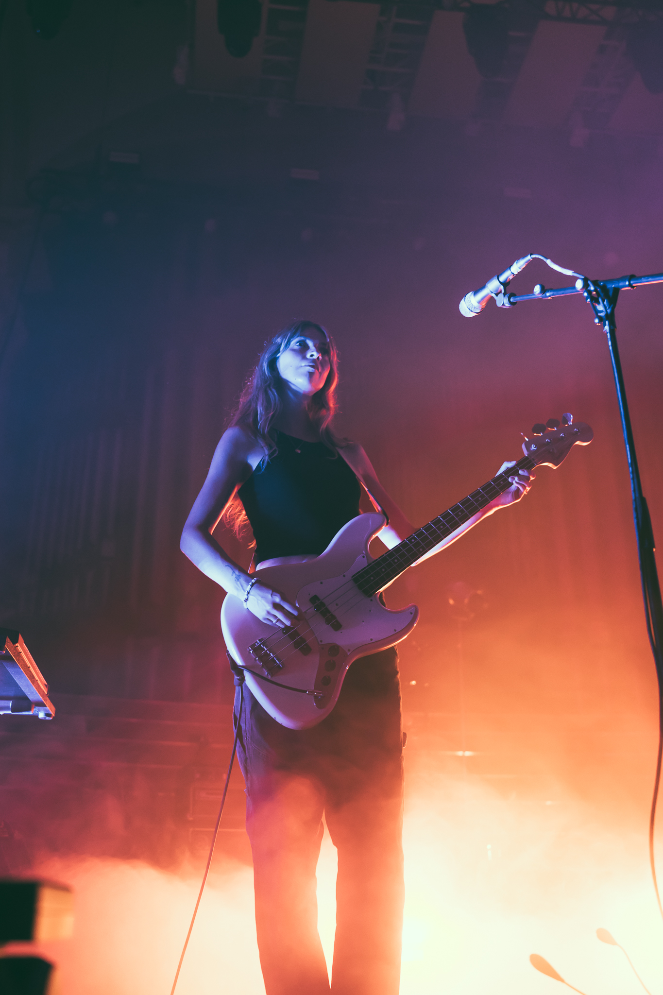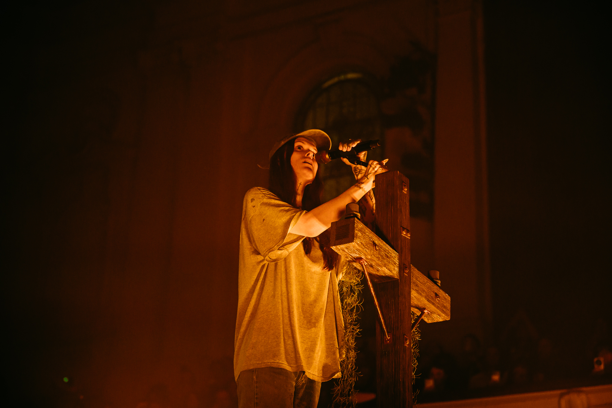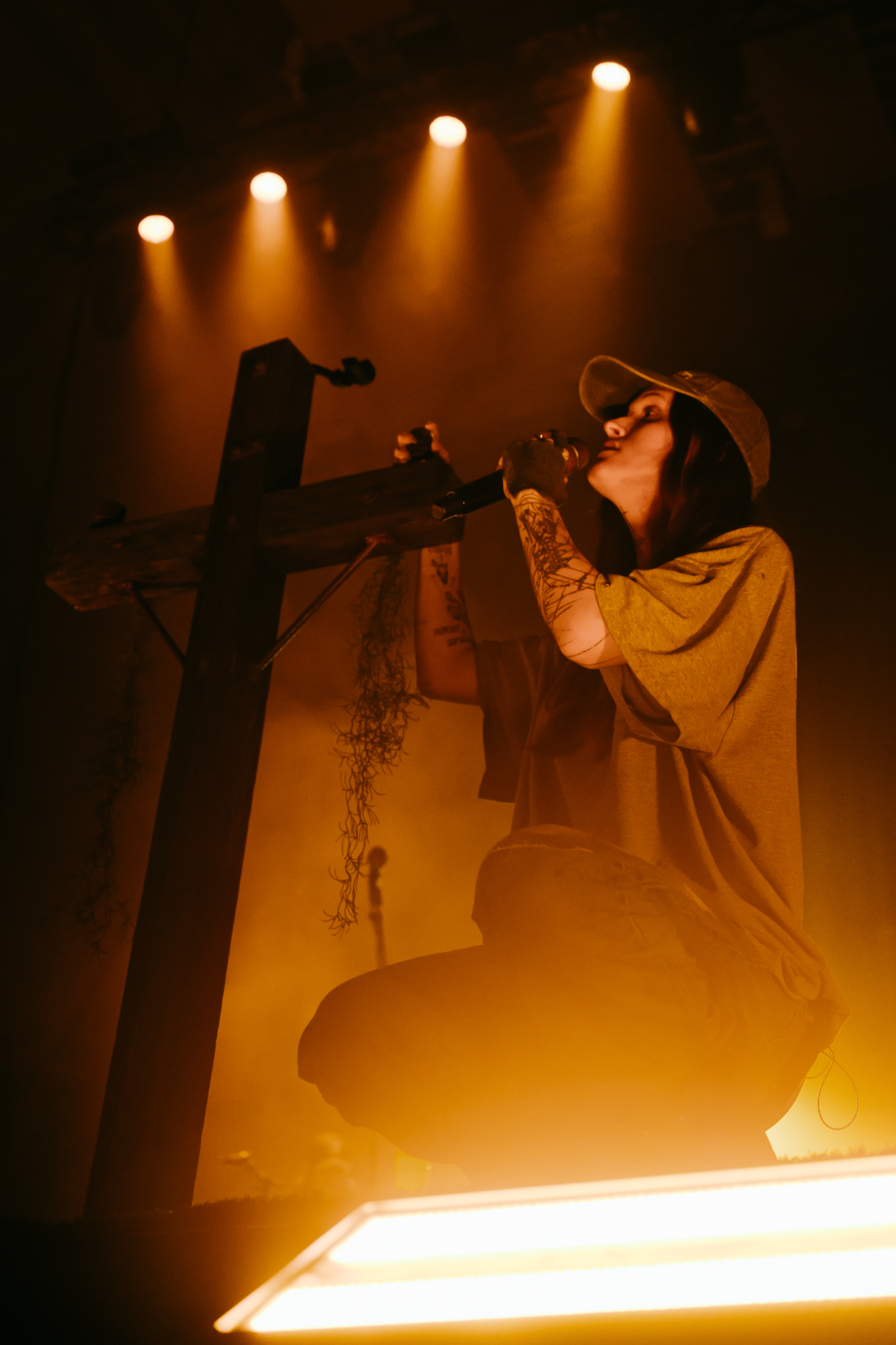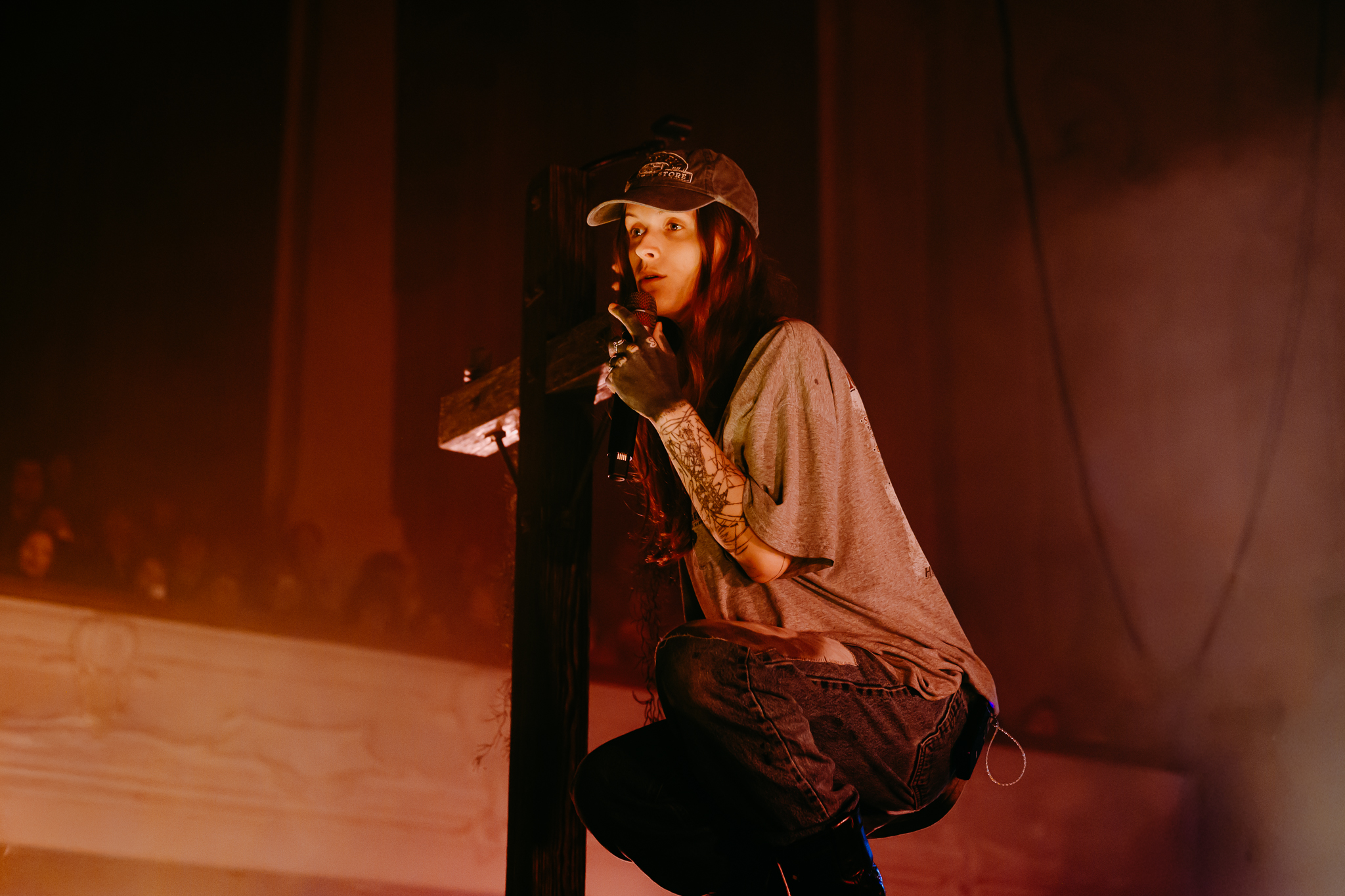 Cain’s music – a few killer singles like American Teenager and Fuck Me Eyes excluded – is mostly all about “the vibe”. It’s dark and murky, like floating in some kind of sensory deprivation chamber (or, as Radiohead put it, “like a pig in a cage on antibiotics”.) The stage setup reflects this – it’s mostly dark, the colours are muted to the point where you could fool yourself into thinking you’re watching an old sepia-toned film, and the dry ice never lets up. This all sounds kinda gloomy on paper, but Ethel Cain seems genuinely excited to be here – it’s the band’s first live show in months – and when she’s not roaming the stage she’s down in the pit or holding her mic out over the audience for call-and-response vocals.