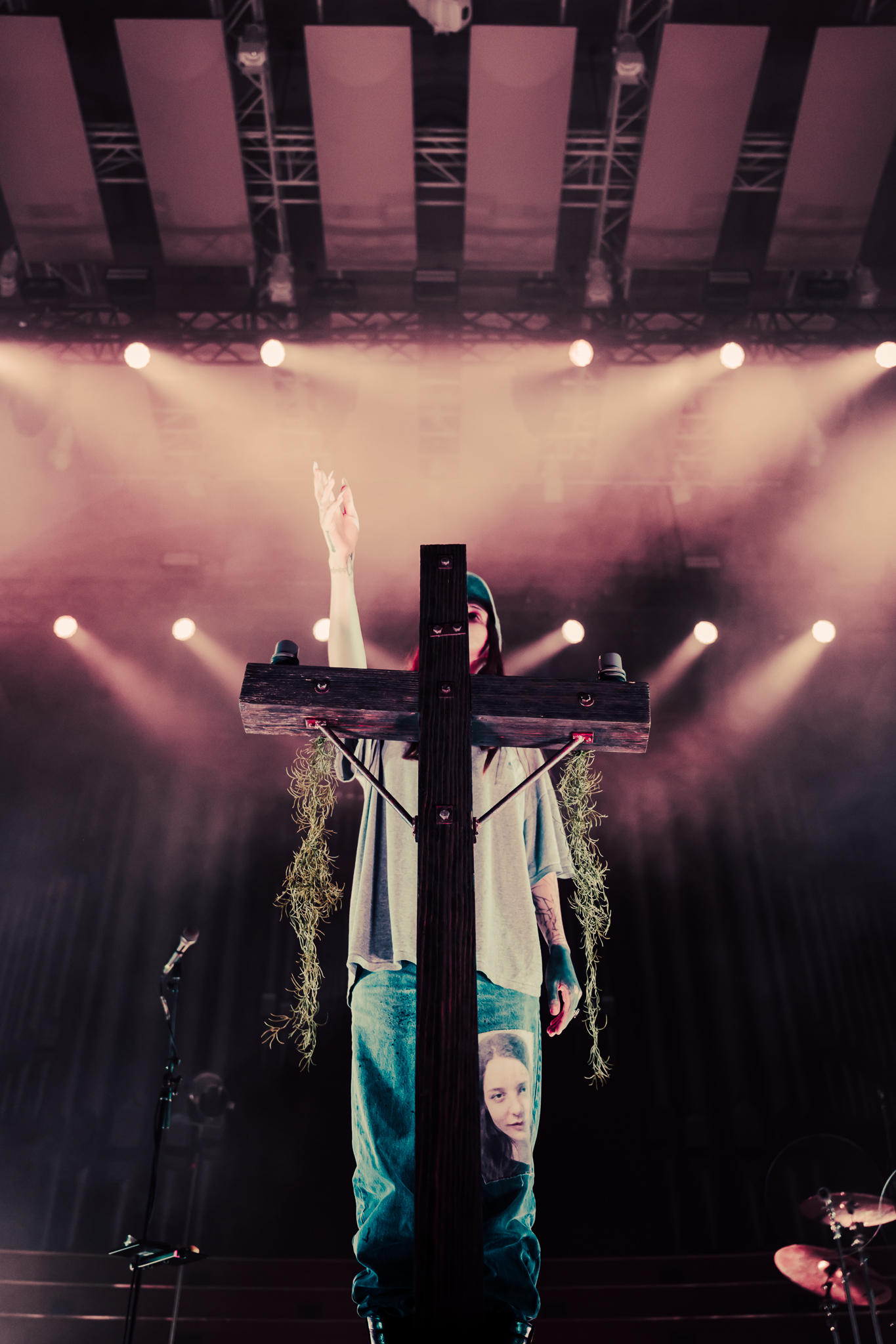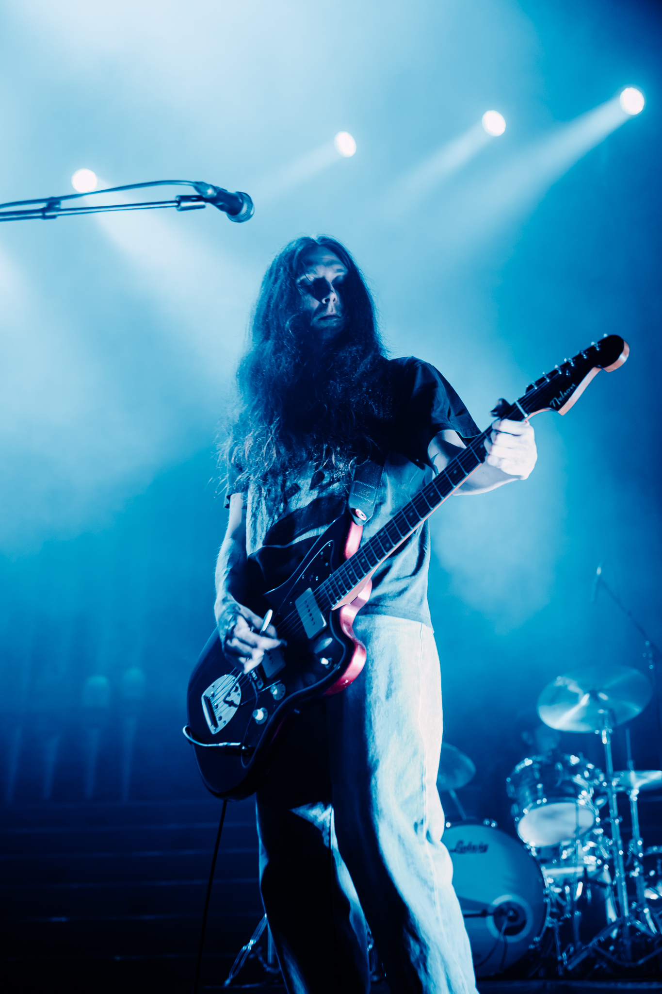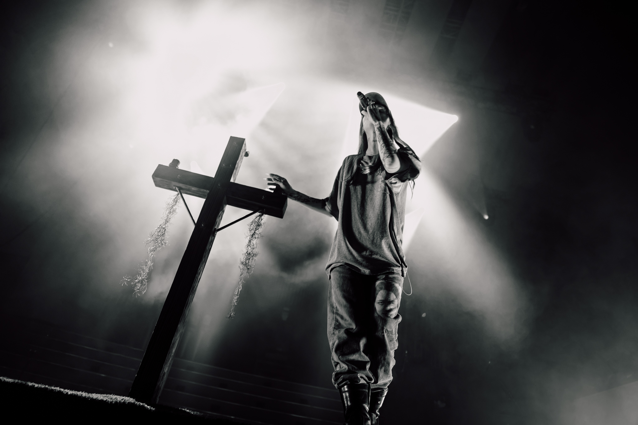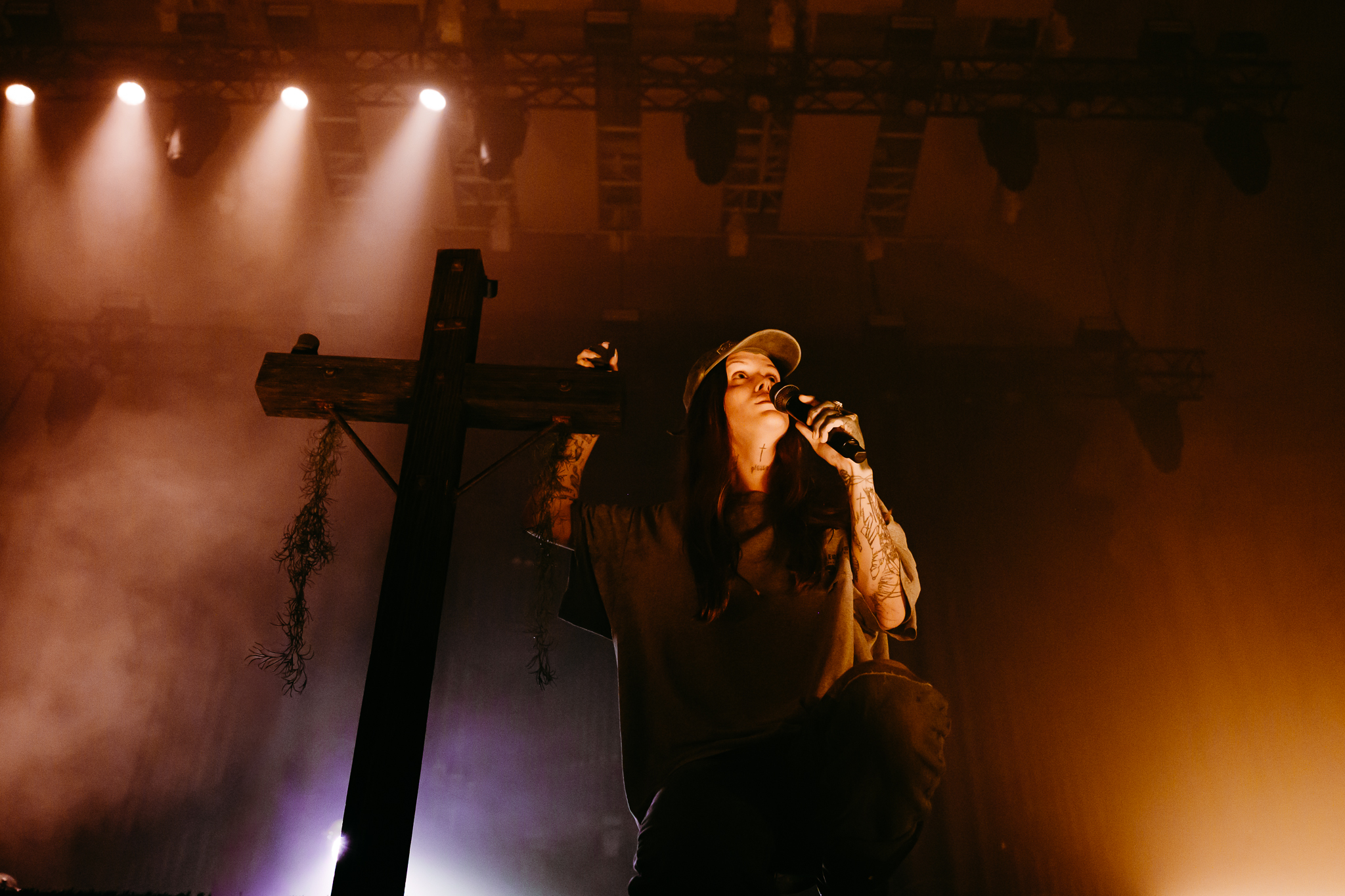 Cain’s music – a few killer singles like American Teenager and Fuck Me Eyes excluded – is mostly all about “the vibe”. It’s dark and murky, like floating in some kind of sensory deprivation chamber (or, as Radiohead put it, “like a pig in a cage on antibiotics”.) The stage setup reflects this – it’s mostly dark, the colours are muted to the point where you could fool yourself into thinking you’re watching an old sepia-toned film, and the dry ice never lets up. This all sounds kinda gloomy on paper, but Ethel Cain seems genuinely excited to be here – it’s the band’s first live show in months – and when she’s not roaming the stage she’s down in the pit or holding her mic out over the audience for call-and-response vocals.