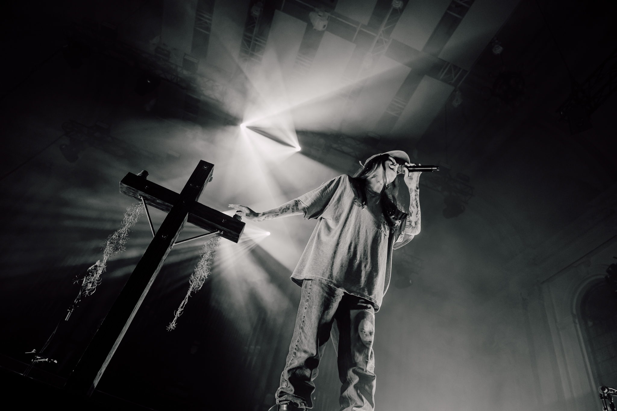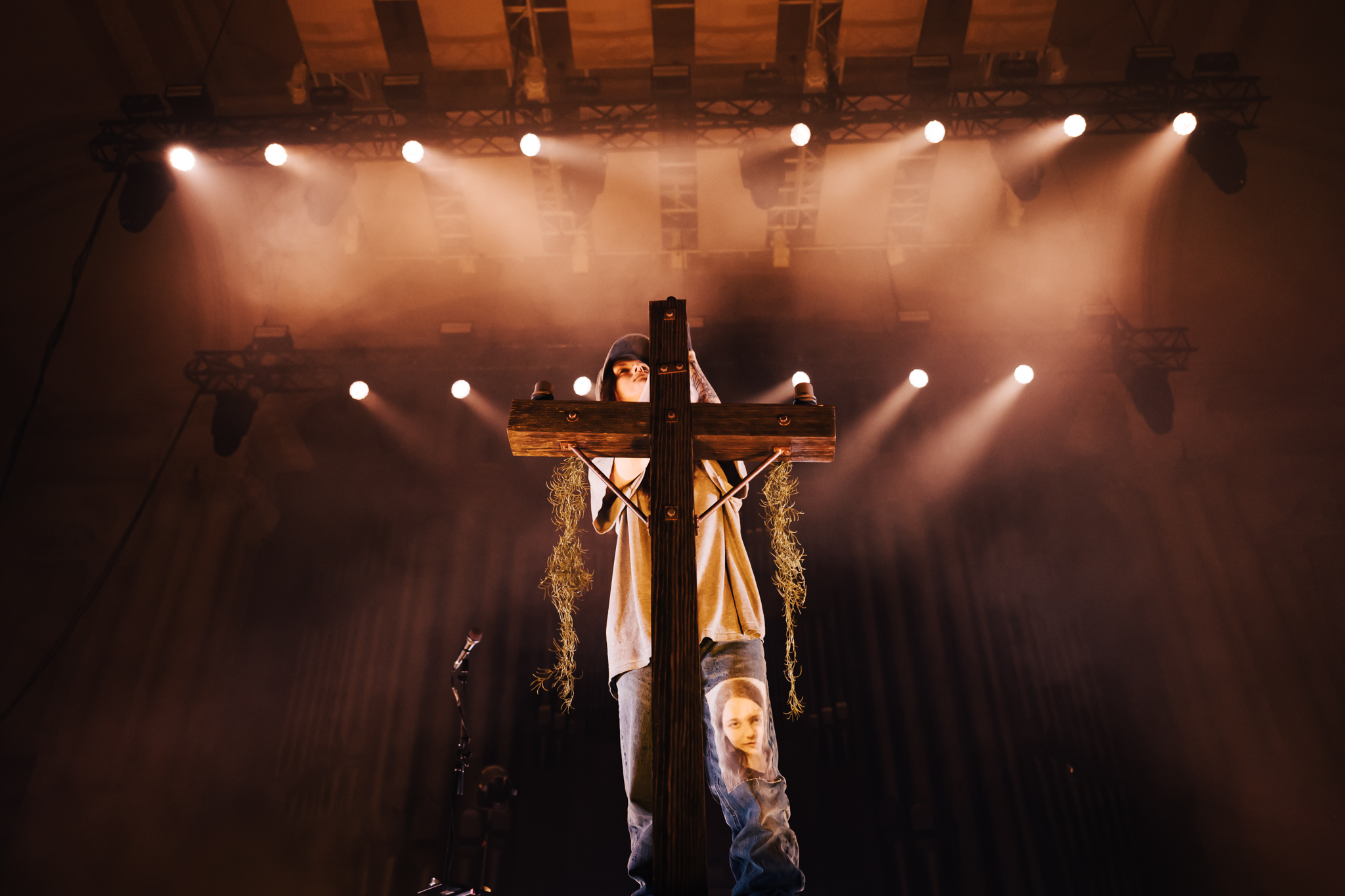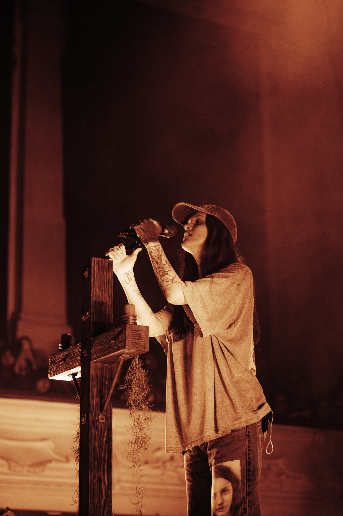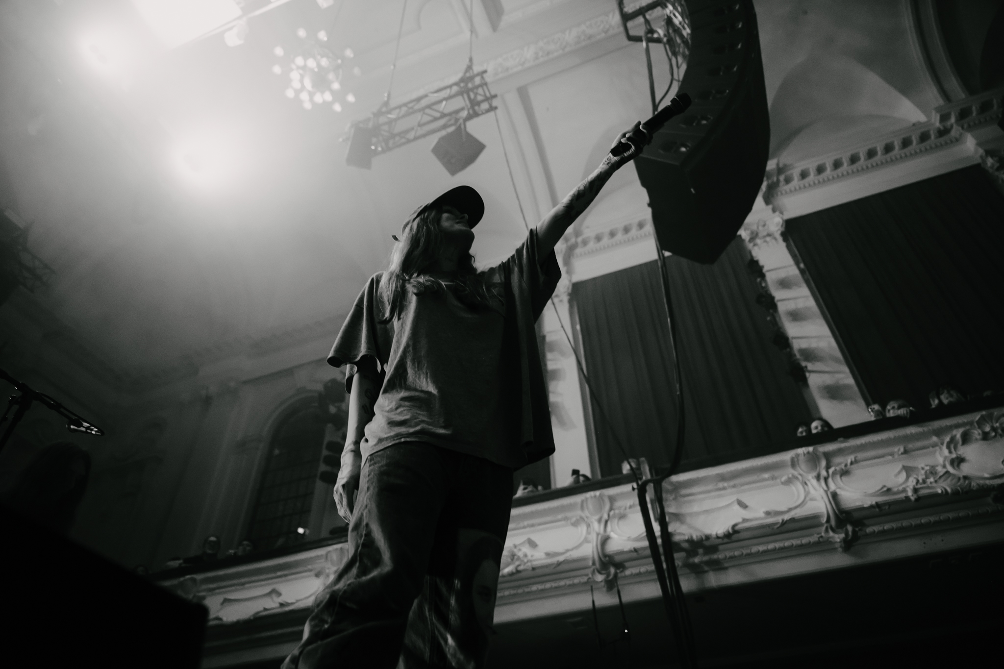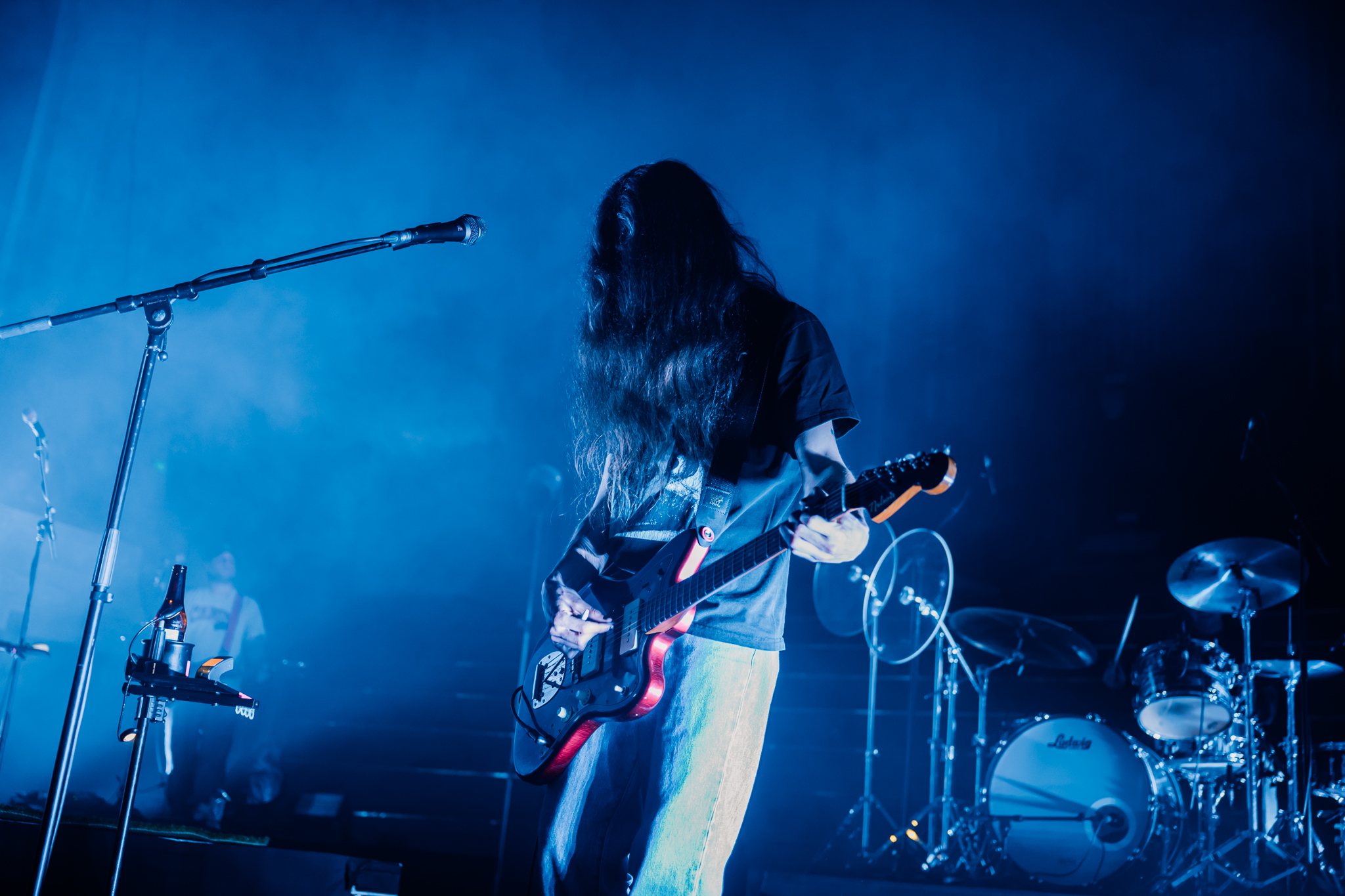 Cain’s music – a few killer singles like American Teenager and Fuck Me Eyes excluded – is mostly all about “the vibe”. It’s dark and murky, like floating in some kind of sensory deprivation chamber (or, as Radiohead put it, “like a pig in a cage on antibiotics”.) The stage setup reflects this – it’s mostly dark, the colours are muted to the point where you could fool yourself into thinking you’re watching an old sepia-toned film, and the dry ice never lets up. This all sounds kinda gloomy on paper, but Ethel Cain seems genuinely excited to be here – it’s the band’s first live show in months – and when she’s not roaming the stage she’s down in the pit or holding her mic out over the audience for call-and-response vocals.