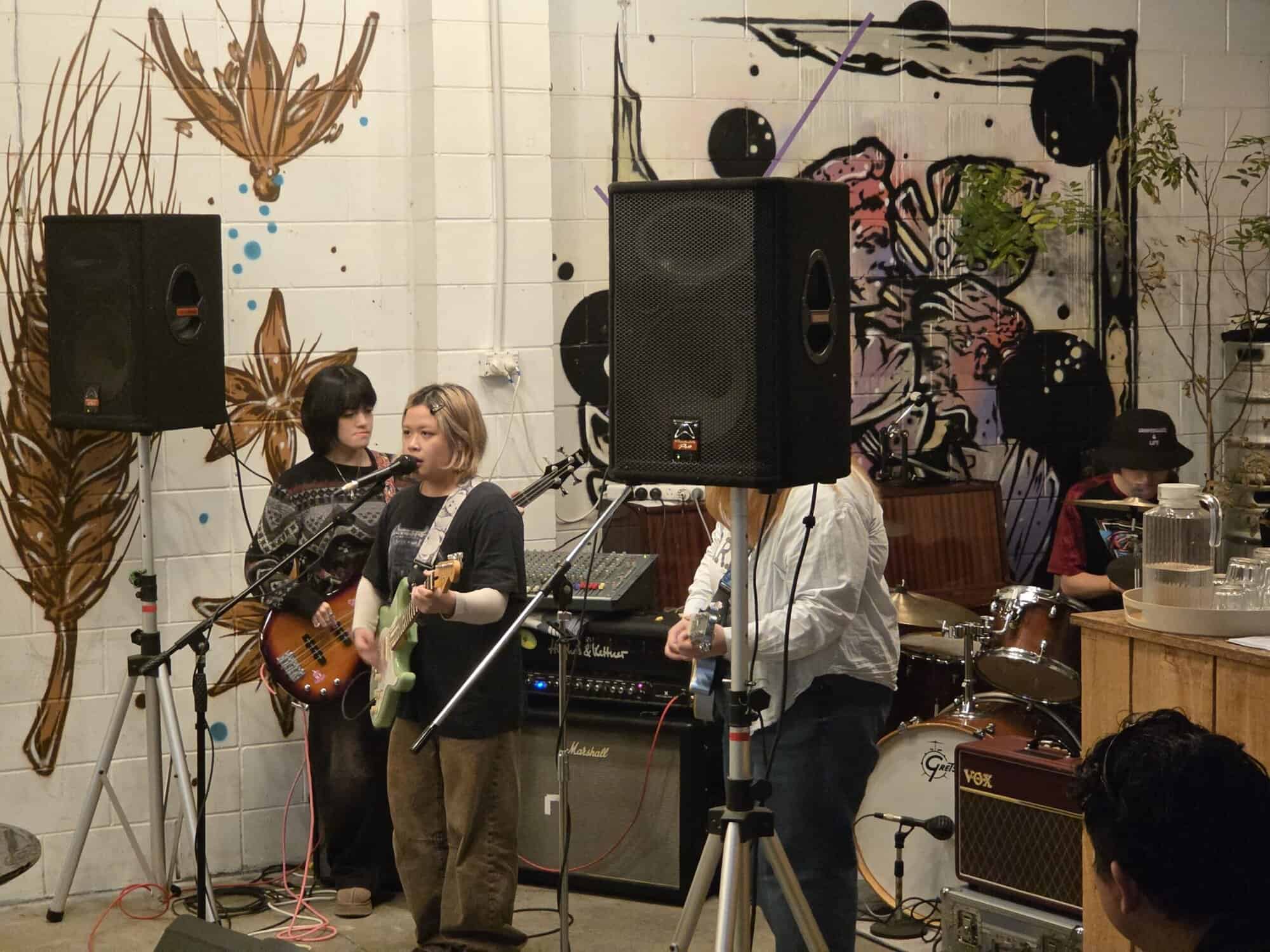 Described as shoegaze-pop-rock, this four-piece (three girls and a guy) were winners of the 2024 Ding Dong Lounge Band Competition, and released their debut single/video Thinking Way Too Much single released in March this year. Their gentle pop-melodic beginnings somewhat juxtaposed the singer wearing a Metallica t-shirt (Ride The Lightning I think) Their second song converses again, in an emoish manner, but by their third tune, an alt-pop-guitar energy dominates, somewhat reminiscent of past acts like The Breeders and Throwing Muses.