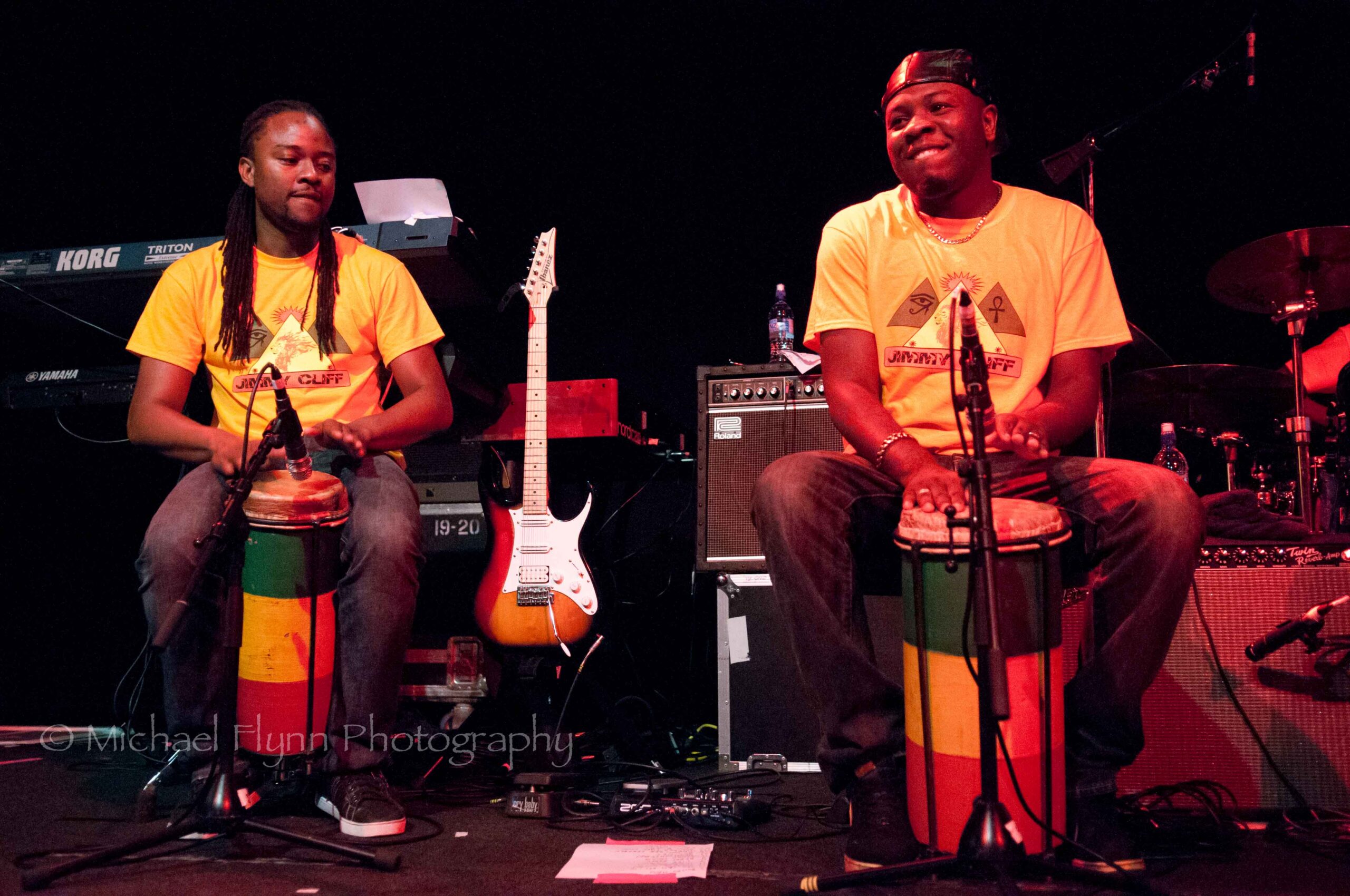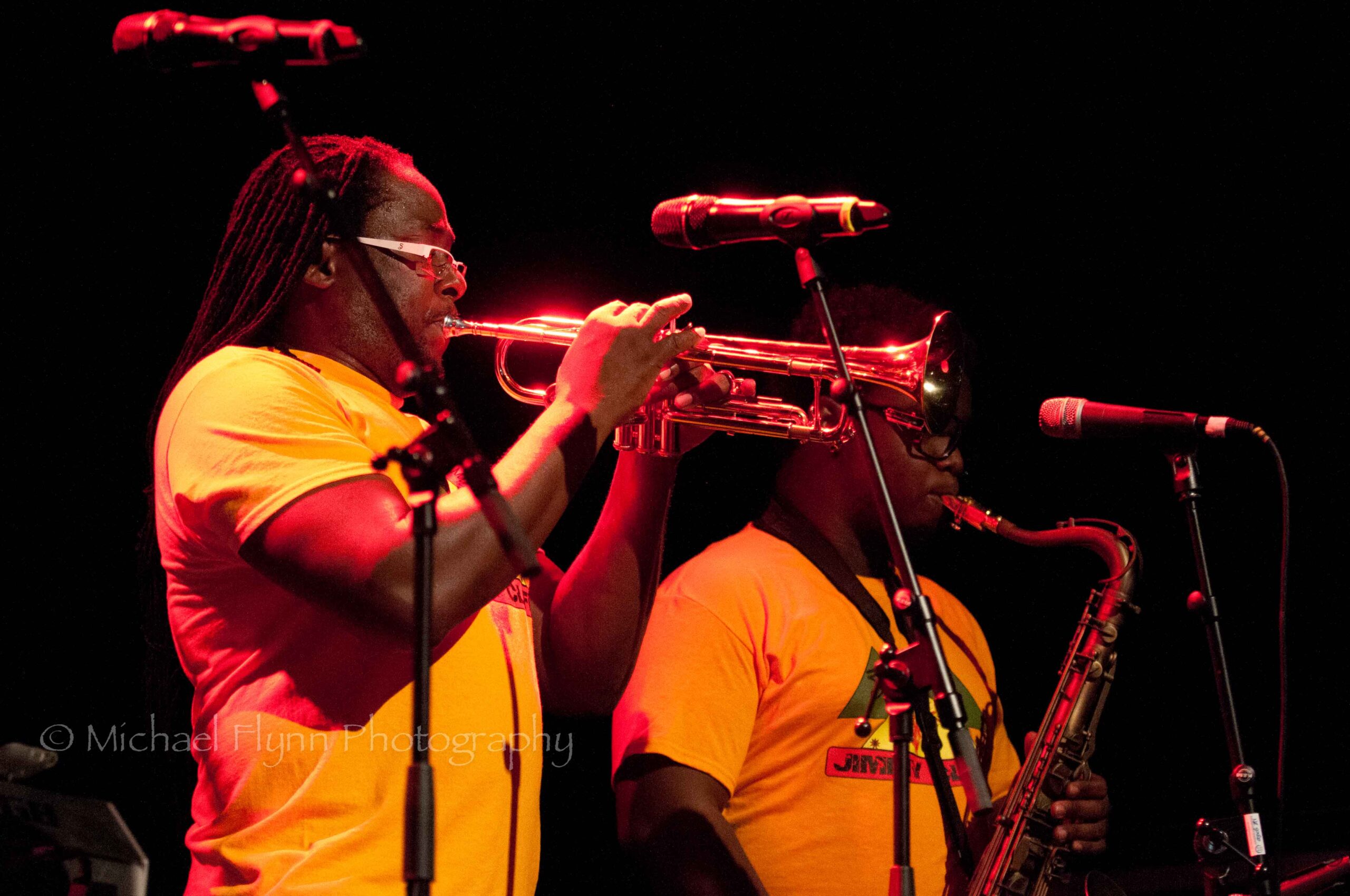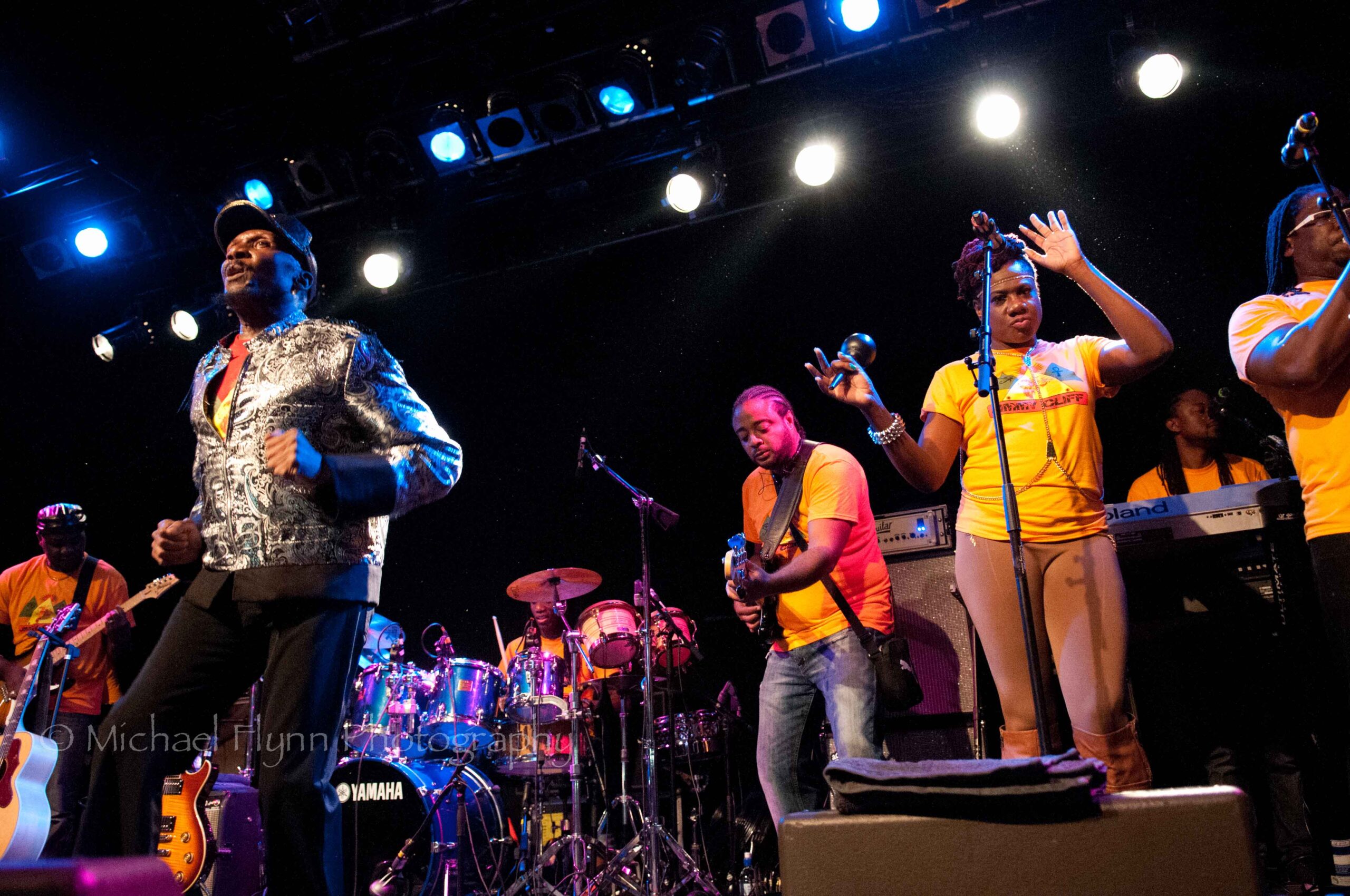 The eight bandmembers (2 keyboard players, guitar, bass, drums, trumpet, sax, female backing vocalist…sorry, no names given) were all dressed in matching yellow Jimmy Cliff T-shirts.