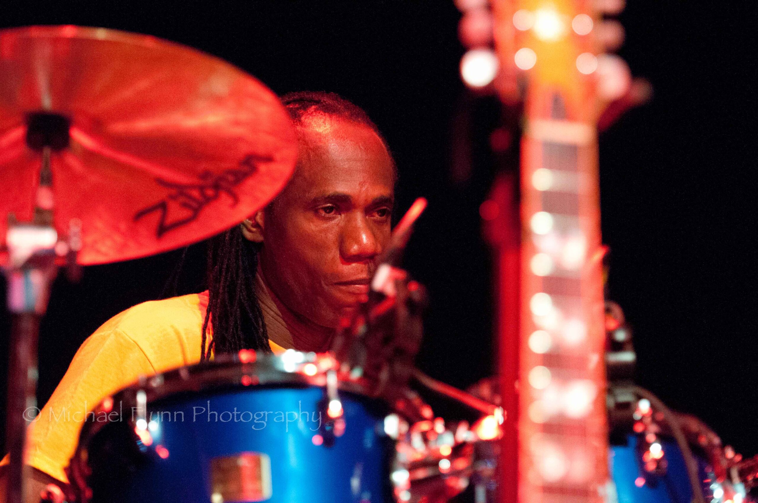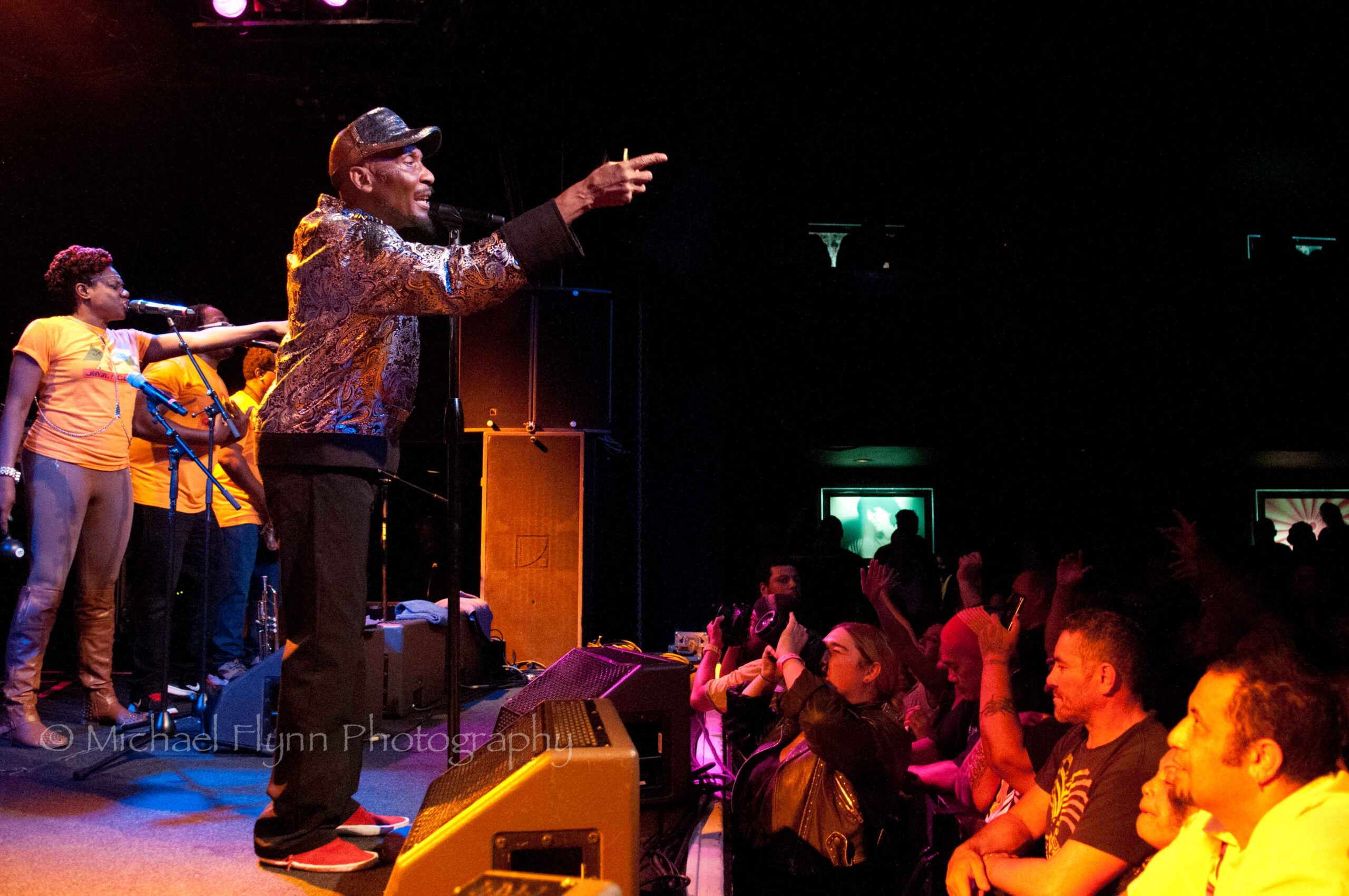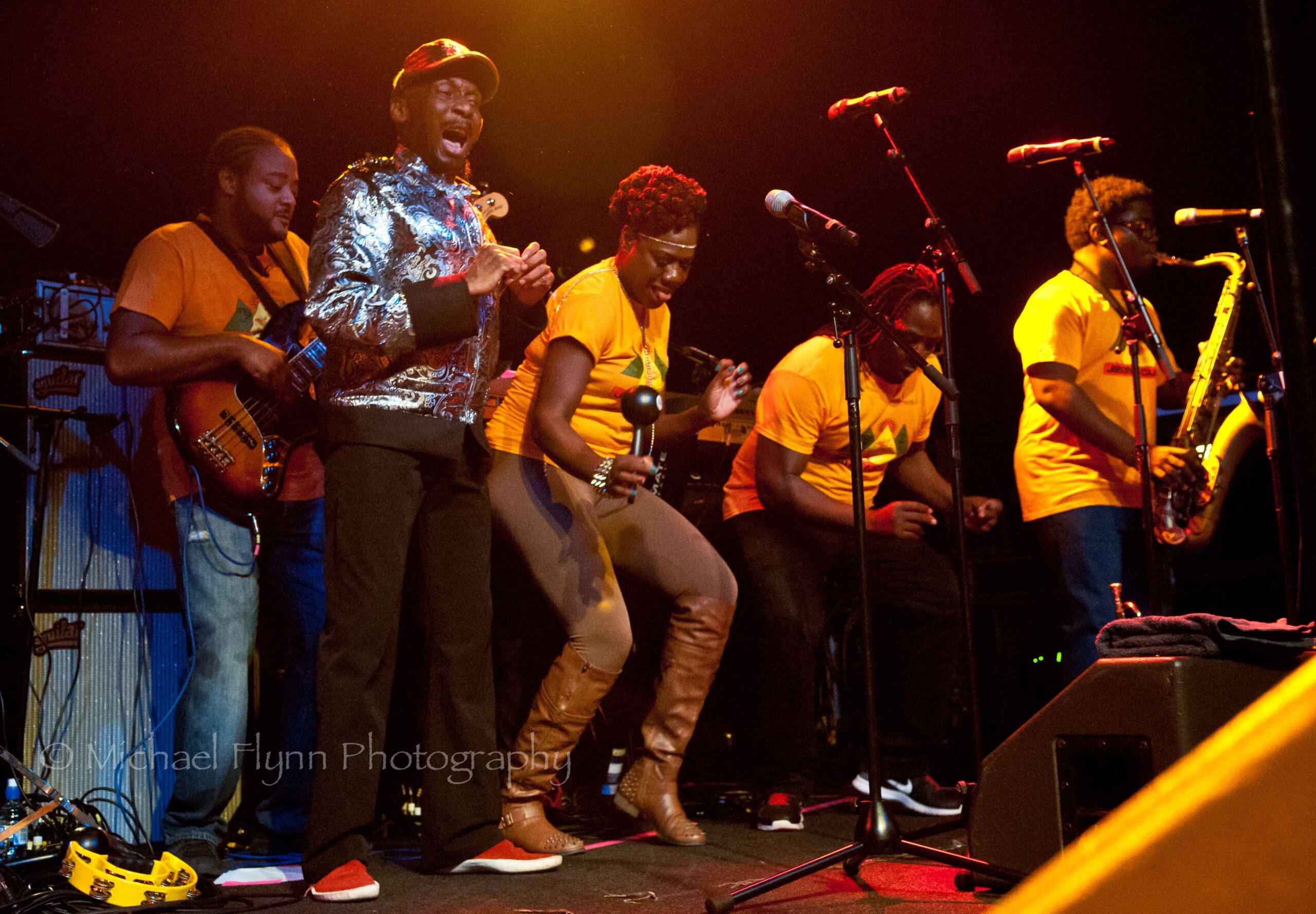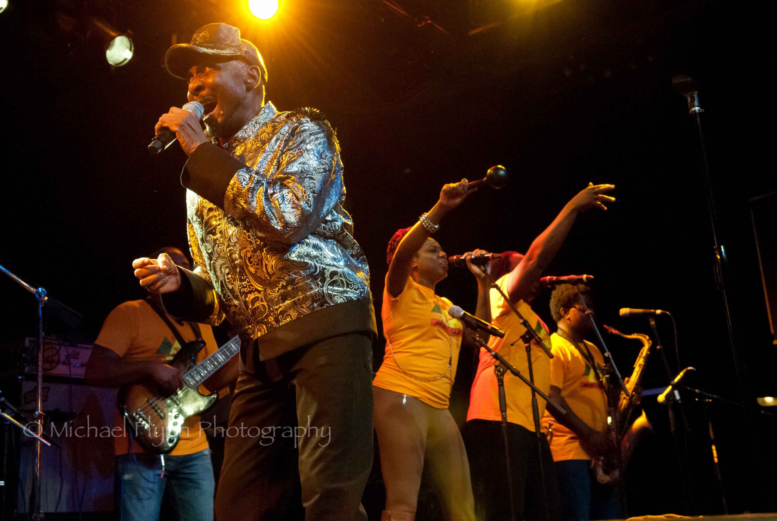 The eight bandmembers (2 keyboard players, guitar, bass, drums, trumpet, sax, female backing vocalist…sorry, no names given) were all dressed in matching yellow Jimmy Cliff T-shirts.