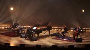 Santiago broadened the palette via more flexible articulation and a sense of breathing rubato within a stable pulse. Rather than strict mechanical repetition, the figuration was inflected—slightly varied accent placement, minute agogic delays at phrase turns—creating the impression of travel without urgency. The ensemble’s role here was to provide depth of field: cello sustain and electronic haze enlarging the harmonic background while the piano provided the narrative.