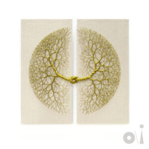 The name Ciclotrama combines the word cycle with the Latin trama (meaning warp or weaving), describing intricate, branching sculptures made from unravelled ropes and organized into fractal structures. The work functions as a continuous flow, where individual trajectories interconnect within a dynamic system shaped by rhythm and physical tension. In Ciclotrama 156 (Palindrome), these ideas are expressed through a mirrored composition structured around a central knot, allowing the piece to be read forward and backward as a visual and structural palindrome.