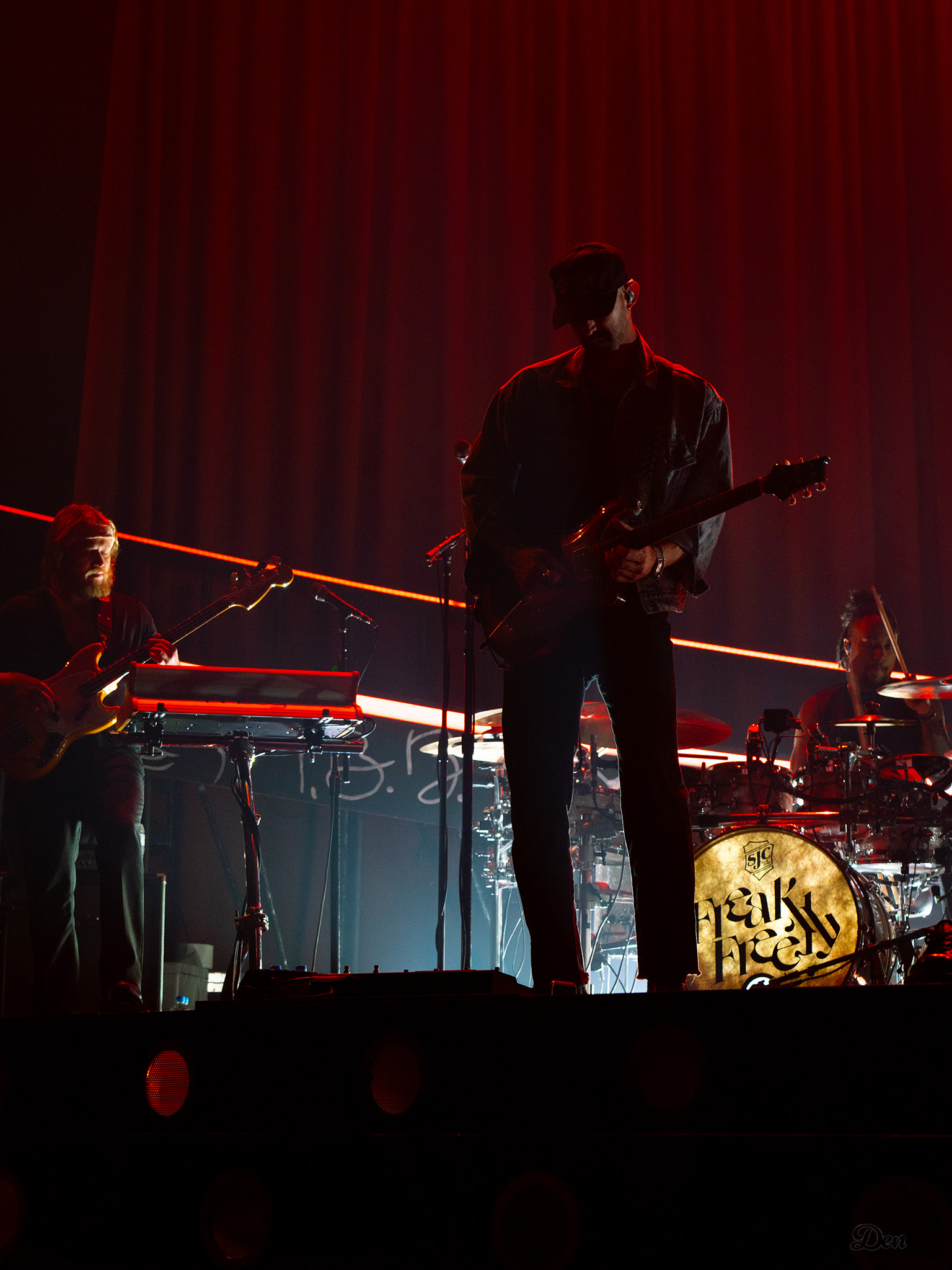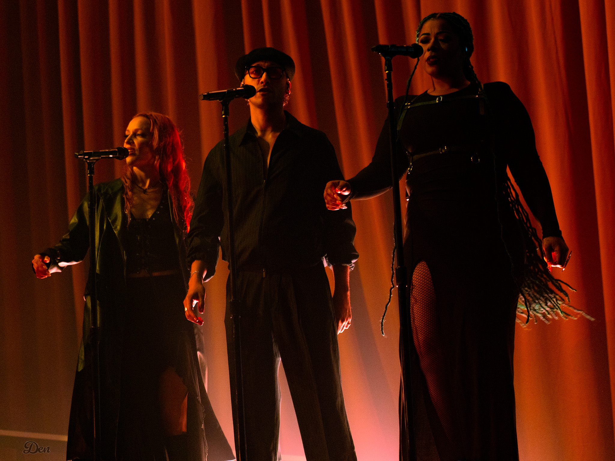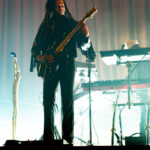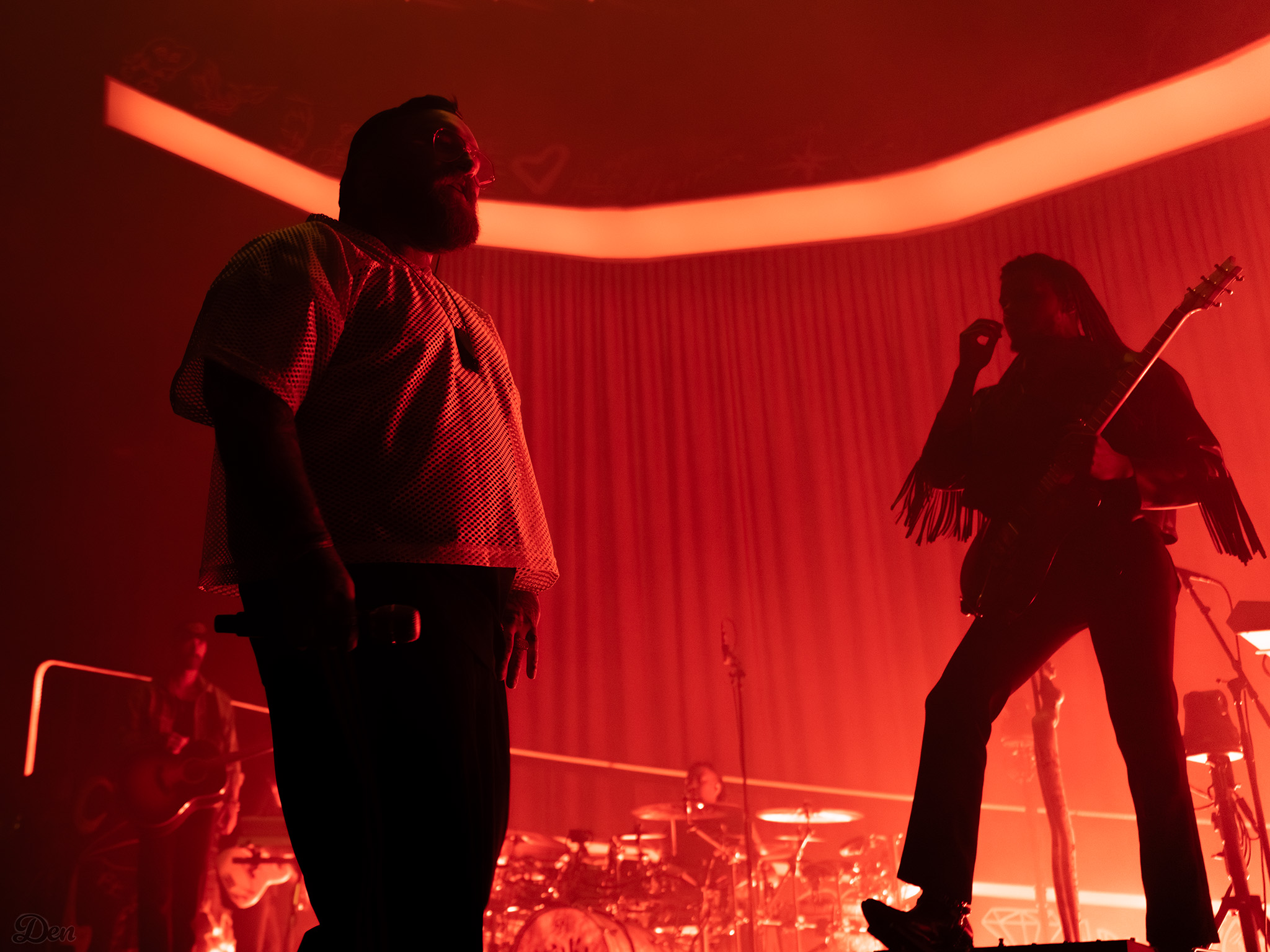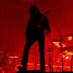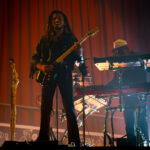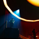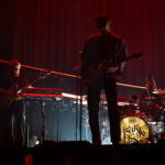 Swims came to the stage at 9pm on the dot – rather late for a midweek Arena-going audience, many of whom appeared to have been drinking their way toward curtain up. Actually, it was more curtain down – a dramatic drop to reveal a red-draped, sophisticated set with a lit podium and curved ramp, more reminiscent of a 1930s nightclub than a contemporary rock stage.