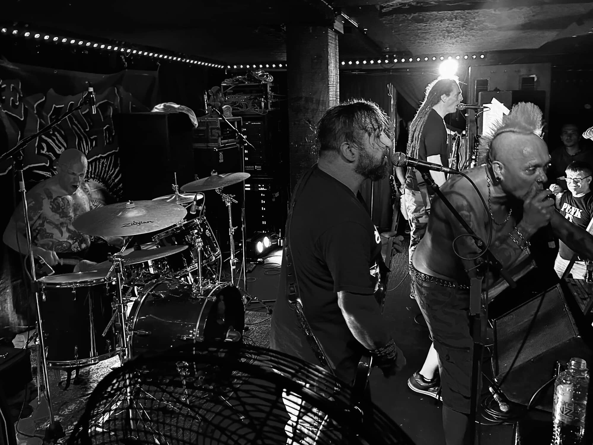 With little banter (a gruff ‘Alright’), The Exploited launched into Let’s Start a War, and the moshing in the Whammy Bar began. Mention is made at the end of punching through the first three songs (which sound tight and well-delivered, since The Exploited have arrived in Tamaki Makaurau at the end of a dozen shows through AUS/NZ) that it’s been three years since guitarist Stevie’s first shows with the band, that 2020 NZ Tour being part of it. Dogs of War starts the crowd singing along, and Wattie shares the vocals duties with the brave upfront souls being crushed on the barrier.